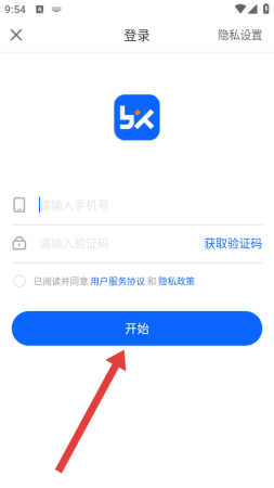 3、在登录的页面,需要输入手机号、验证码,勾选协议后点击开始的按钮,完成账号登录流程。