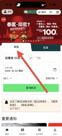 1、打开亚洲航空app,在首页确认行程类型为单程,若不是则点击切换为单程。