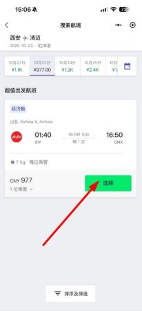 3、点击查询航班按钮,浏览搜索结果,选择合适的航班,点击选择。