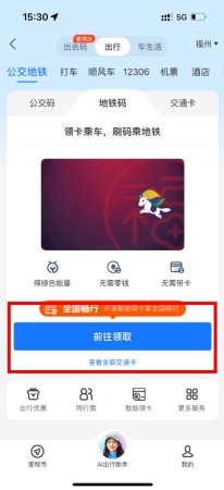 4、进入页面后,点击地铁码选项,点击前往领取按钮,按照页面提示完成相关操作,即可领取地铁卡。