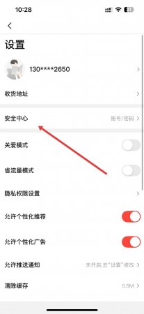 2、进入设置页面后,找到并点击安全中心,进入账号安全页面。