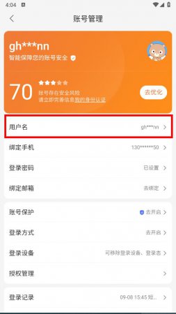 4、在账号管理界面中点击用户名选项,进入用户名修改页面,点击修改用户名,按照提示输入新昵称完成修改。