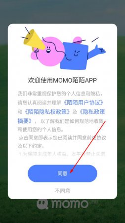 1、首次打开陌陌APP,在协议弹窗点击同意,接受陌陌用户协议、陌陌隐私权政策等。