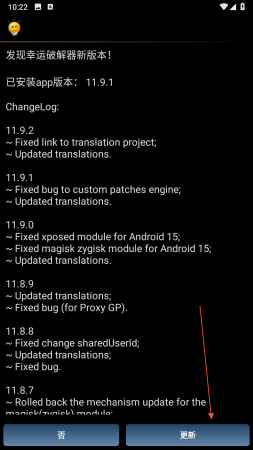 2、当发现幸运破解器有新版本时,可查看版本更新日志,了解不同版本的修复和更新内容,若需要更新,点击更新按钮,进行版本升级。
