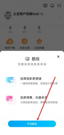 2、在弹出的酷投提示框中,需要点击开启酷投按钮,以此进入投屏准备环节。