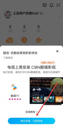 3、确认电视已安装CIBN酷喵影视后,点击我已安装,立即体验按钮,即可进行投屏操作。