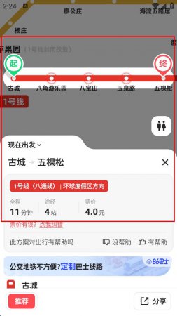 3、设置好起点和终点后,软件会生成对应的地铁出行方案,展示出乘坐的线路、途经站点数、所需时间以及票价等信息,方便查看地铁出行详情。