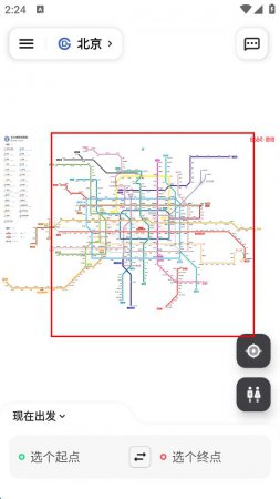 2、进入北京地铁页面后,可看到北京地铁线路图,点击线路图下方的“选个起点”和“选个终点”,分别设置出发站点和到达站点,比如起点设为古城,终点设为五棵松。