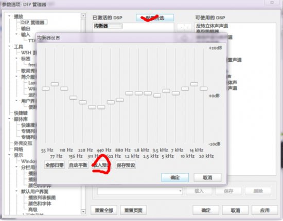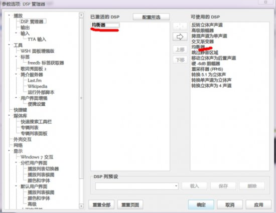 图3.输出设备的设置〓4.DSP管理的设置,dsp是数字信号的处理,我们可以理解为音效处理。新手建议使用均衡器就可以了,对于其他音效插件(dfx,BBE,重低音,杜比环绕以及各类音效)的使用,以后会在那些音效插件里讲到。