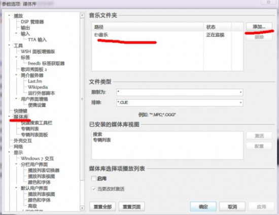 〓2.进入参数选项后,首先设置自己的媒体库(如下图),如果下载的懒人包上有别人的歌曲列表(当然是播放不了的),可以删掉他设置的媒体库和播放列表(建议选中后用delete键)。