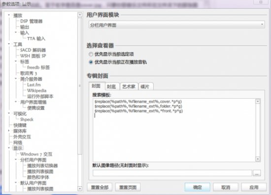 $replace(%path%,%filename_ext%,)cover.jpg //显示文件名为cover的封面,名字可以自己改为cover就能显示这张图片了,格式可以自己改为png,jpeg,注意!!!改为cover.*p*g就是通吃这些格式啦,不过有些面板不支持,所以你也可以多写几个,后缀分别是jpg、png,下面几个代码亦如此。至于名字是否是cover.jpg,只要你那音乐文件所在文件夹下的那张图片名字和代码里的文件名一致就能显示了,大家可以改下代码试试,如:改为$replace(%path%,%filename_ext%,)zhuanji.jpg ,然后把那张图片改为zhuanji.jpg就一样能显示。一句话:两者一致对于就能显示 。