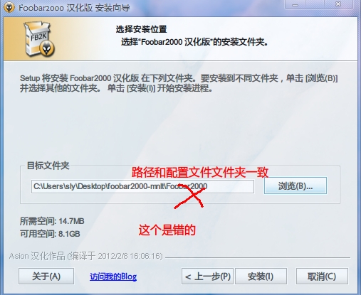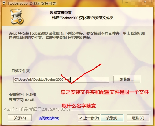 图6.安装程序是会自动添加Foobar2000的后缀的,这样会将foobar安装到Foobar2000文件夹,而我们是要把它安装到配置文件夹foobar2000-mnlt,所以你可以将这个后缀去掉,总之保证配置文件所在的文件夹就是foobar2000安装的最后路径,如下图7.至于取什么名随意,取为foobar2000也完全可以,注意不要装到foobar2000文件夹下的foobar2000文件夹里就行了。