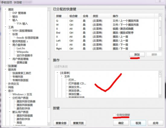 PS:预设文件一般在foobar程序文件夹的Equalizer Presets文件夹了,若无此文件夹,可以去下载。一般原因是你下的懒人包没有这些配置文件或者你在安装程序包时没有选中”均衡器配置文件“,可以自己去尝试调下均衡器,调一个自己听得惯的保存起来。〓5.快捷键的设置:快捷键的使用会极大的带来操作的便捷感,特别是全局快捷键(在上网,看电影,打游戏时切歌,切播放列表,切foobar界面,调音量什么的)。这儿我说下自己常用的几个快捷键:ctrl+方向左右键是全局的左右切歌;ctrp+方向上下键是全局调音量;ctrp+END是全局暂停/播放;alt+方向左右键是全局快进/后退;ctrl+s是全局的显示隐藏foobar;其他快捷键还有”播放下一个播放列表“、”随机播放“等。至于设成什么键大家按喜好来就行,shift键也很有用~