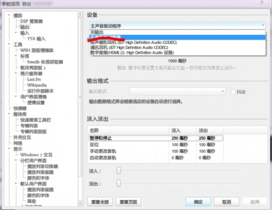 图1.媒体库的设置〓3.输出设备设置(见下图),一般选中主声音驱动程序,其他的选项取决于你电脑的声卡驱动类型,自己尝试下不同吧。