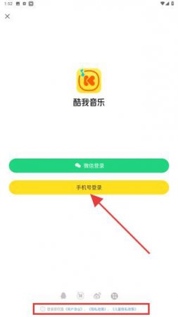 1、打开酷我音乐APP,会直接弹出登录页面,在界面内点击手机号登录。