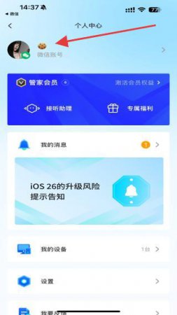 2、进入到个人中心的页面内,再次点击用户头像、昵称的区域。