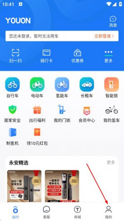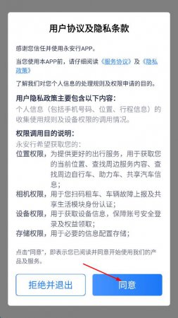 1、打开永安行APP,在用户协议及隐私条款界面,仔细阅读相关内容后,点击同意,进入APP主界面。