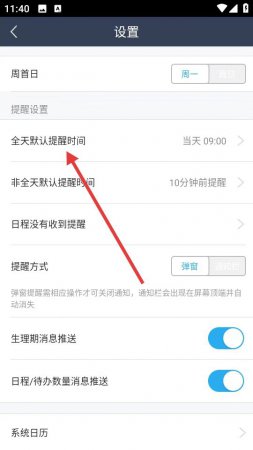 3、进入设置页面后,点击全天默认提醒时间选项。