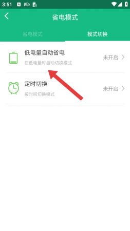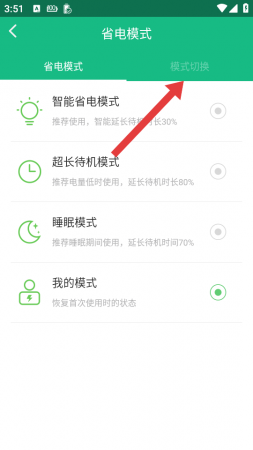 2、在省电模式页面,点击模式切换,进入自动设置选项界面。