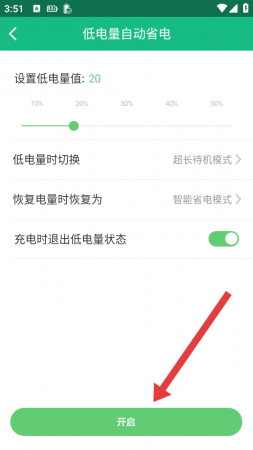 4、在页面设置好低电量值等参数后,点击开启,即可启用低电量自动省电功能。