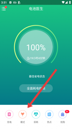 1、打开金山电池医生app,点击底部模式,进入省电模式设置页面。