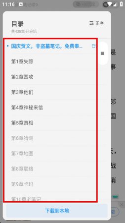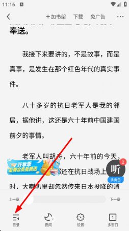 3、进入阅读界面后,点击屏幕中间位置唤出隐藏菜单,在底部菜单中找到并点击目录选项就能查看小说目录内容。