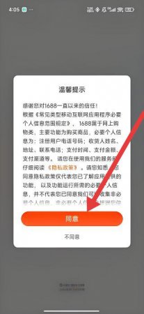 1、通过点击温馨提示弹窗中的同意按钮,确认1688隐私政策,进入应用首页开始使用应用购物。