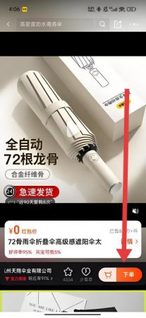3、在商品详情页,可以通过点击箭头指示下方下单按钮,启动全自动72根龙骨遮阳伞的购买流程。