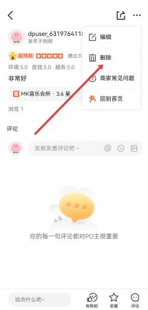 3、在弹出的功能菜单中,我们需要点击删除的这个选项,即可按照提示完成点评删除的操作。