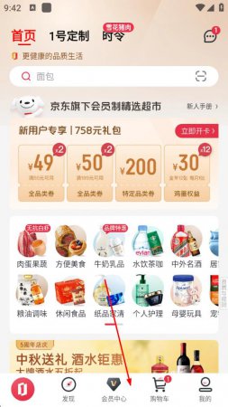 1、打开1号会员店App,进入首页,点击底部导航栏中的会员中心。