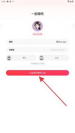 2、登录后,会弹出头像与昵称的设置,用户可任需设置,设置后点击开启我的唱吧之旅即可进入到首页。